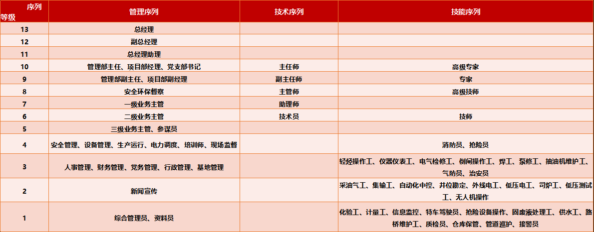 公司岗位共分13个等级,岗位层级是根据知识技能、解决问题的能力、承担的职务责任等多维度因素的综合评定结果,体现不同层次岗位的纵向价值差异。