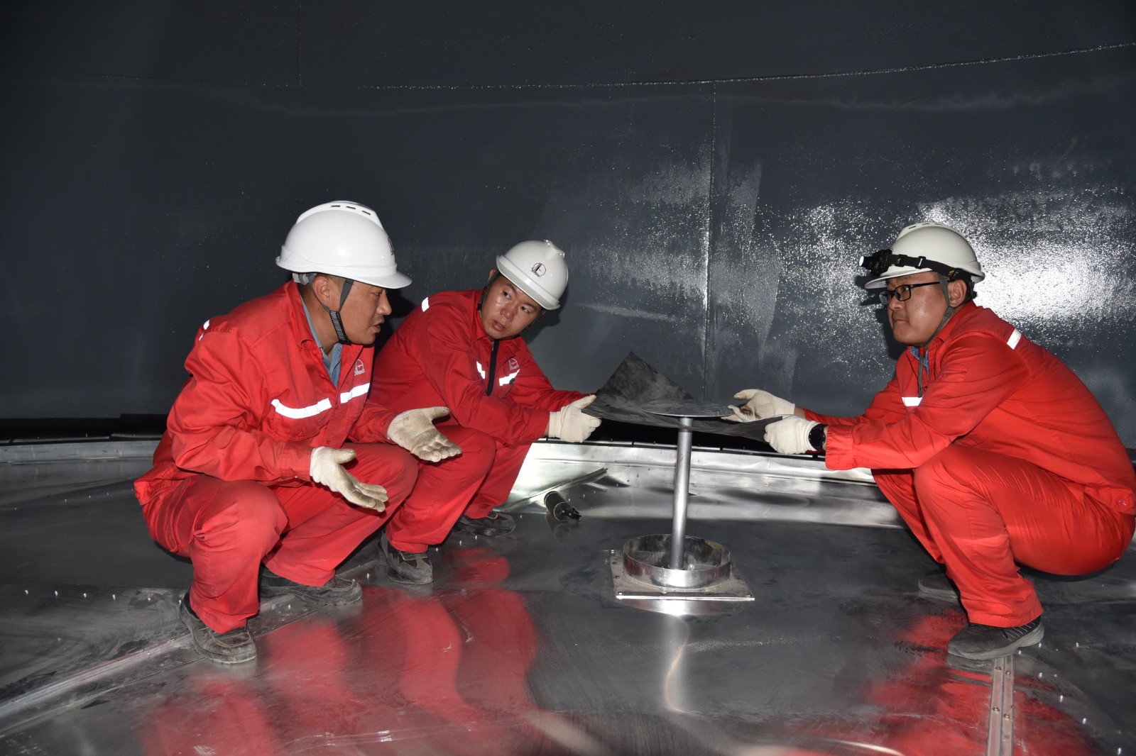 分工明确后,大家按照施工方案都开始忙活开了。“要进入大罐里面施工,在提前打开逐流风机的同时,一定要先检测一下里面有没有硫化氢及可燃气体,必须保障人员安全。”只听担任第一组组长的马振杰一边大声的提醒其他人员,一边就用长杆子将检测仪绑好,伸进了罐里进行检测。随着马振杰一声:“三合一检测仪检测结果都是零,区域内安全,可以进罐作业了。”作业正式开始。这时,只见赵刚同志戴着头灯,第一个从人孔爬进了罐内,大家将手钳、卡环、螺丝等工具用具递了进去,然后也一起爬到罐内。他们对大罐浮球、钢丝绳、浮盘底部螺丝等进行检查紧固作业,大罐里面又黑又热,虽然汗水湿透了衣背,但工作开展的毫不含糊。